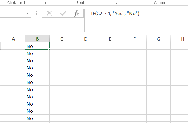 您的Excel公式错了。你需要双引号表示“是”和“否”,也需要逗号来分隔你的论点,而不是分号。尝试以下几点: