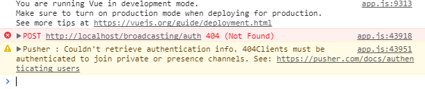 POST http://localhost/broadcasting/auth 404 (未找到) Pusher :无法检索身份验证信息。404客户端必须经过身份验证才能加入私有或存在通道。