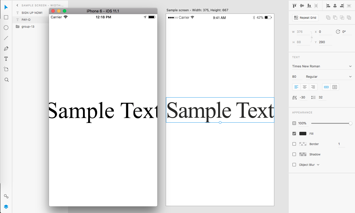 我正在从Abode的设计中开发iOS应用程序UI。 Abode使用哪一个单元来处理字体大小?我尝试在Xcode中使用相同的字体大小(80),但是它有细微的差别,附了一个屏幕截图。我们这里需要转换吗?