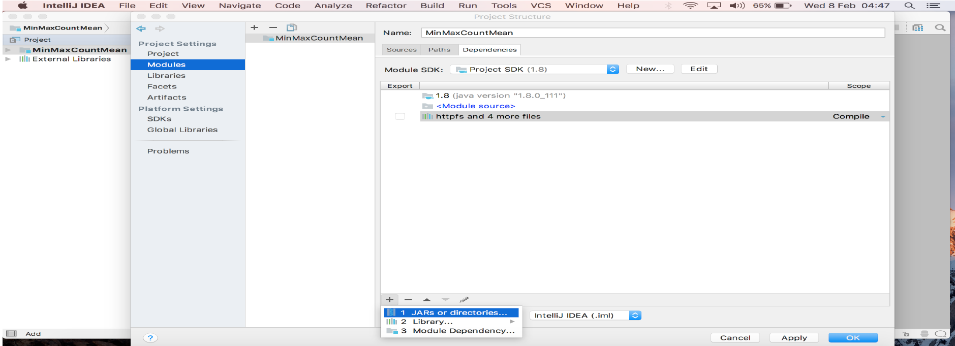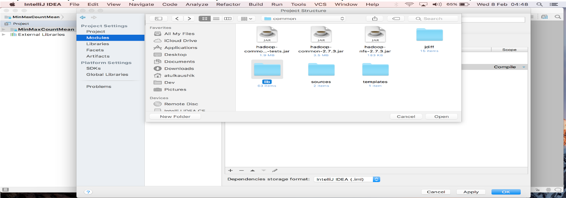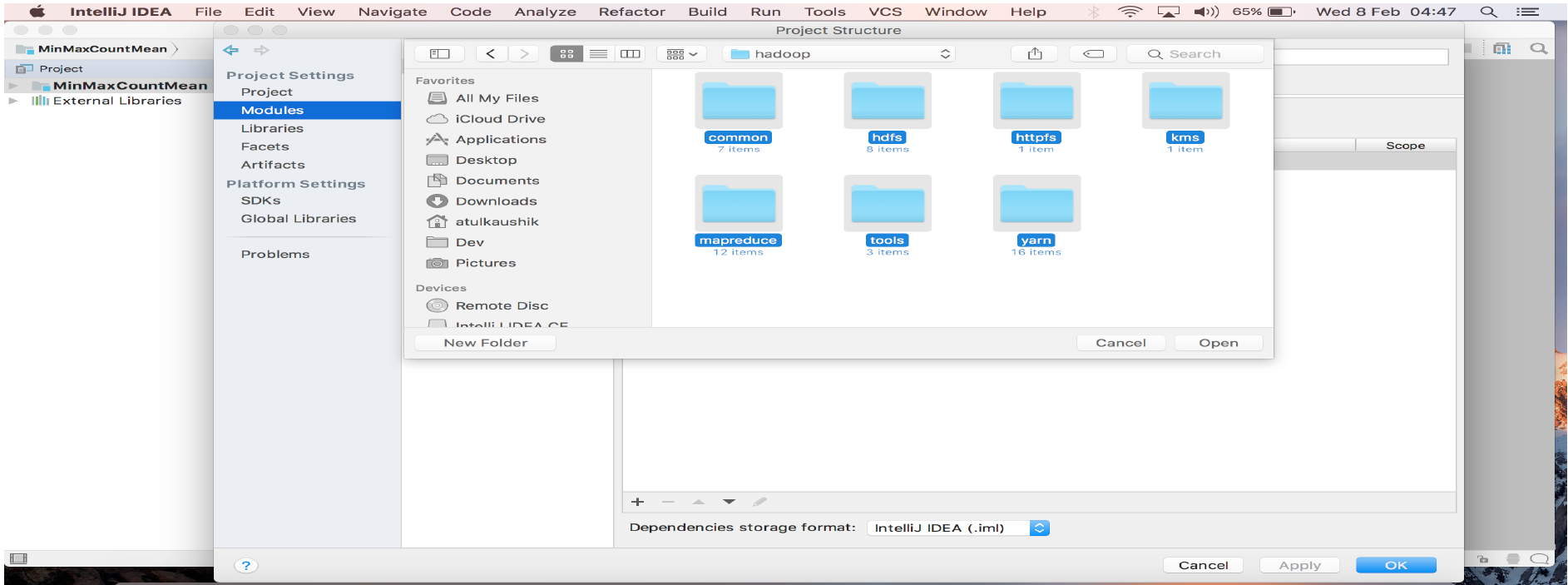 brew upgrade hadoop现在在/usr/local/Cellar/hadoop/2.x.x中安装/更新hadoop,我们将尝试从intelliJ中的这个位置导入依赖项。