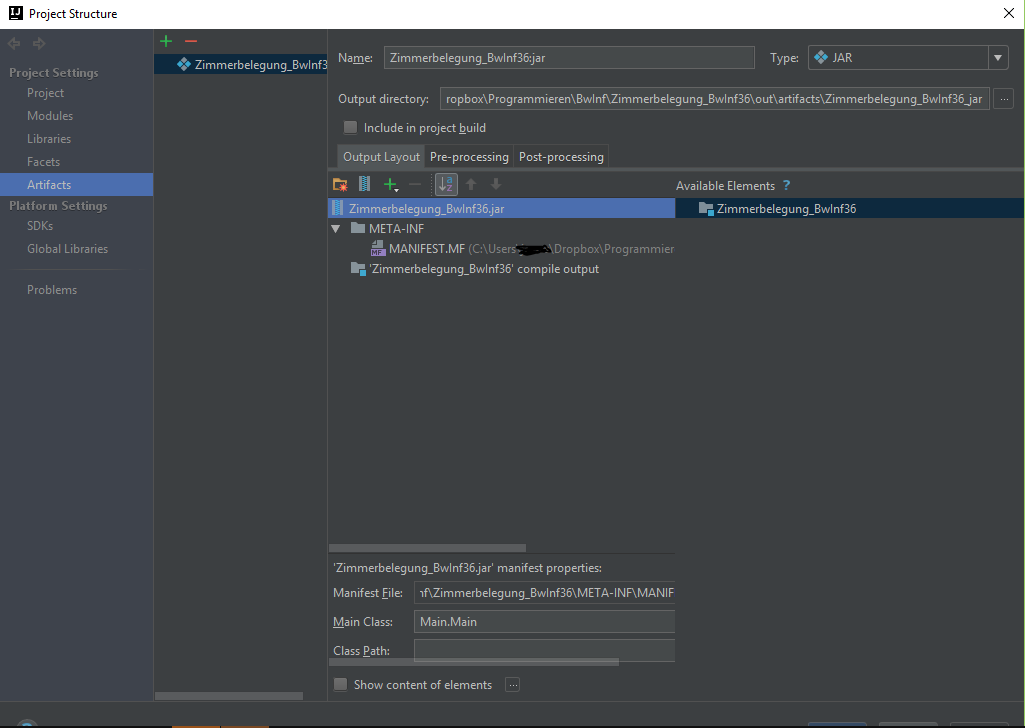 当我试图构建我的.jar (如描述的here)时,我在.idea文件夹中的artifacts文件夹中得到一个MANIFEST.MF和一个xml文件。但是,我在artifact文件夹中没有一个.jar文件的out文件夹。这就是.jar文件的位置。这个构建过程早些时候起了作用,我不知道我搞砸了什么。