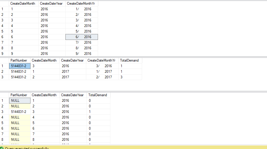 我的目标是“垫”第二个表,使TotalDemand在几个月内没有销售。我非常接近(见第三表),但我无法让PartNumber在没有销售的情况下出现。