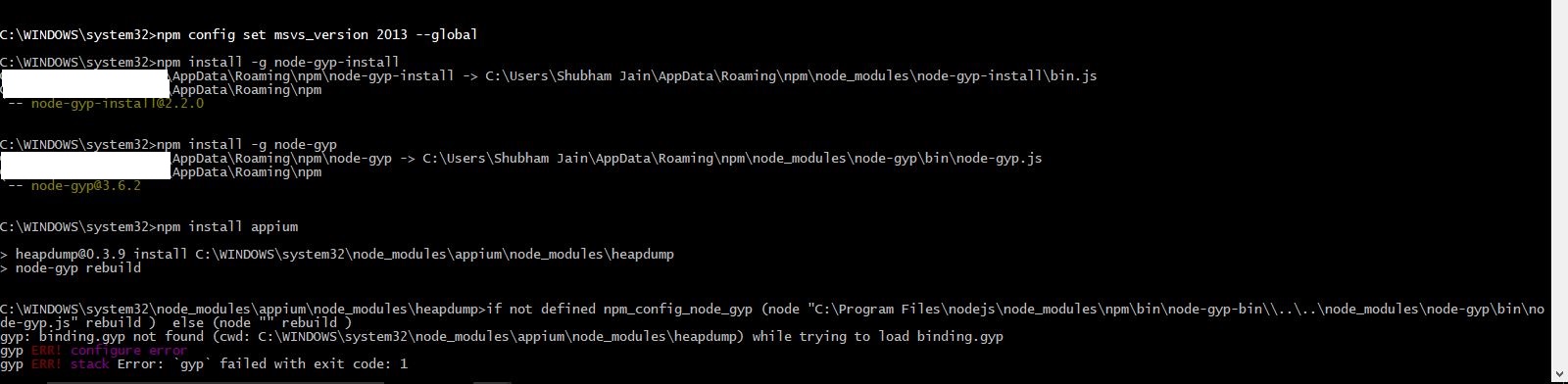gyp失败,退出代码:1,gyp!堆栈在Files\nodejs\node_modules\npm\node_modules\node-gyp\lib\configure.js:305:16) ChildProcess.onCpExit (C:\Program )在emitTwo (events.js:106:13)健身房堆放错误!在ChildProcess.emit (events.js:191:7)健身房堆放错误!堆栈在Process.ChildProcess._handle.onexit (内部/子流程.12:215:12)系统Windows_NT 10.0.15063!命令“C:\ Files\nodejs\node.exe”"C:\Program Files\nodejs\node.exe“"rebuild”gyp!cwd C:\WINDOWS\system32\node_modules\appium\node_modules\heapdump绞车!节点-v v6.11.0gyperr!节点- -v v3.4.0gyp错误!不确定C:\WINDOWS\system32 32‘- appium@1.7.1