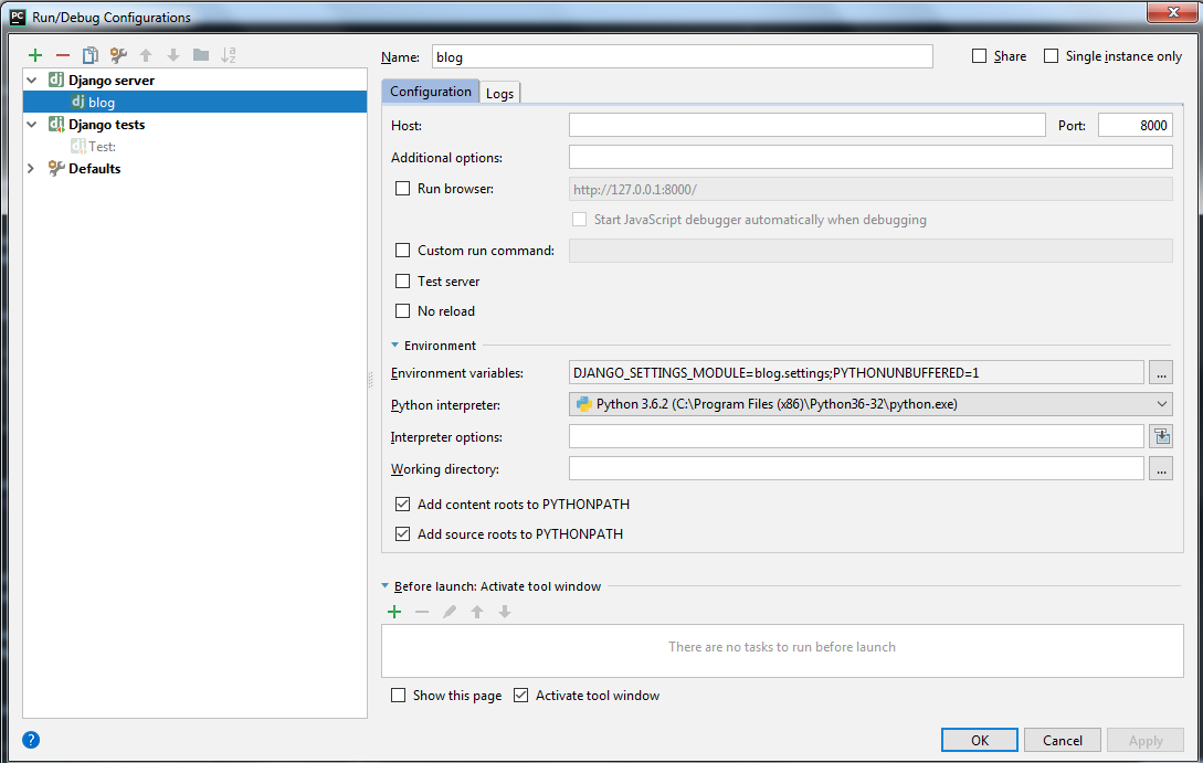 当您使用Pycharm时,您需要项目右上角的enable环境,您需要选择编辑配置,您可以在那里添加您的设置文件并启用django,查看这个图像,应该如下所示