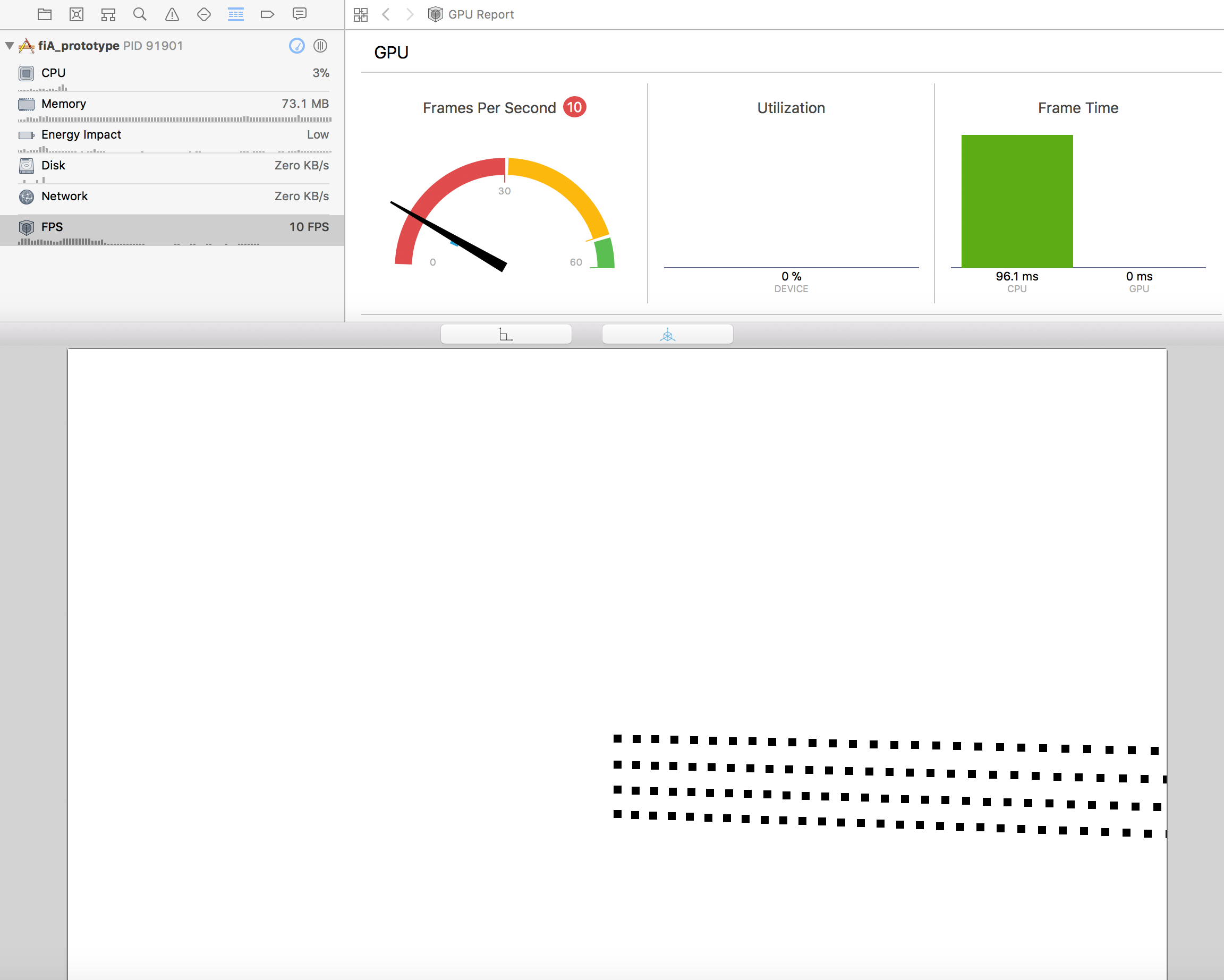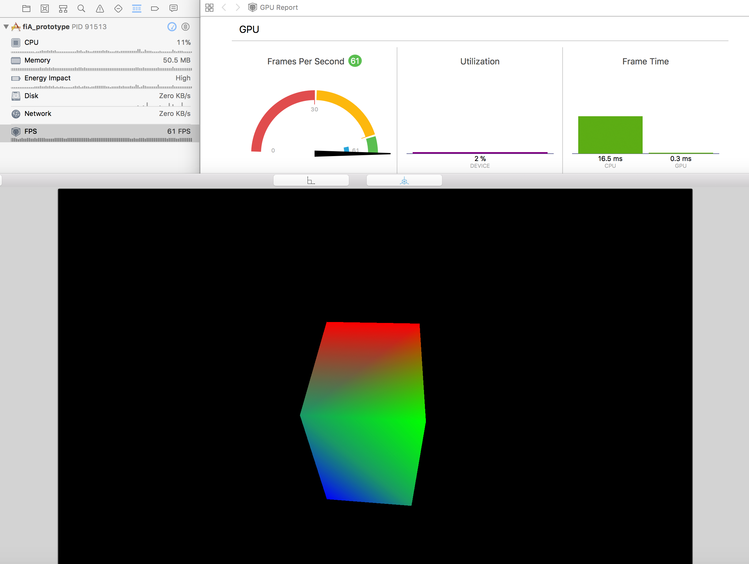我已经成功地实现了一个MTKView,它很好地呈现简单的几何学和低顶点计数(立方体、三角形等)。我实现了一个基于鼠标拖动的相机,它可以旋转、散落和放大。以下是我旋转多维数据集时xcode FPS调试屏幕的屏幕截图: