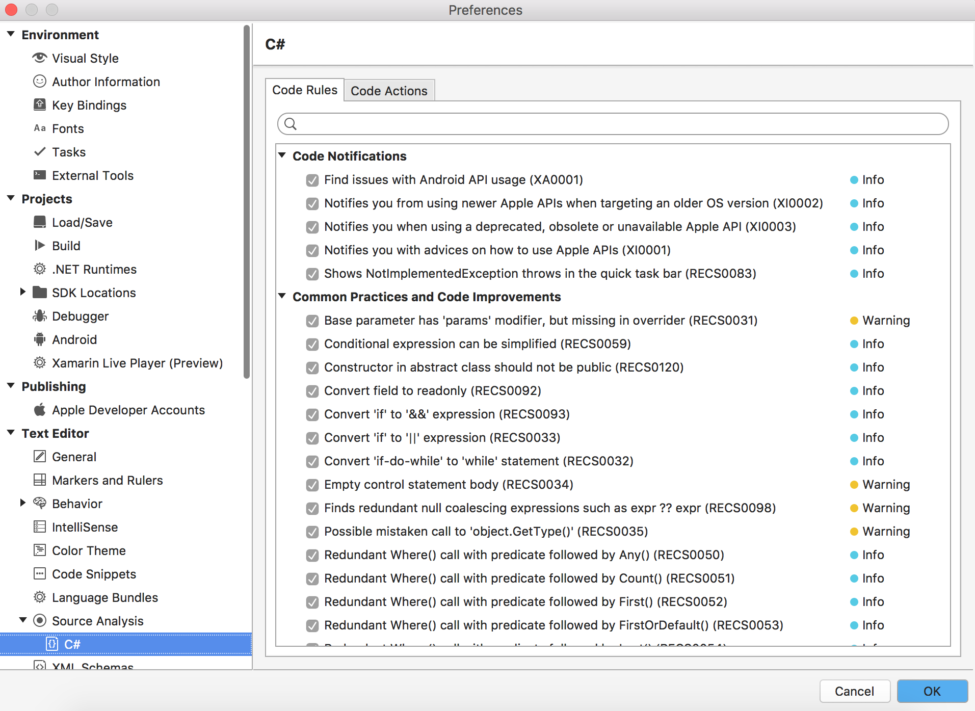 您可以在文本编辑器-源分析- C#部分的preferences对话框中看到代码规则警告列表。