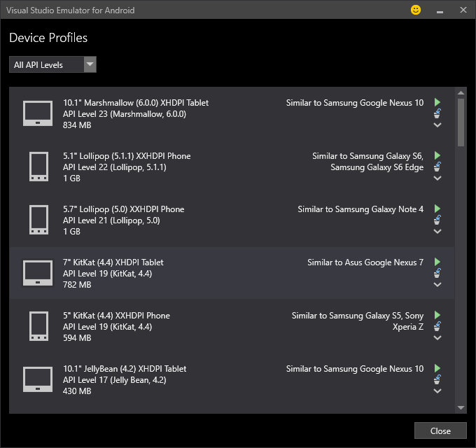 首先为Android打开Visual模拟器并启动其中一个仿真器