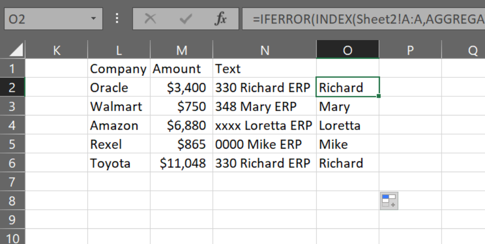 Toyota $11,048 330 Richard ERP我想查看"Text“列中的每一项,根据以下范围的名称搜索该项: