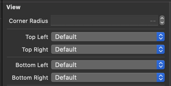 请记住,默认设置在/ true上(因此"cornerRadius“影响视图的所有角落)。如果你想绕过所有的角落,除了一个,只需将这个特定的角设置为false。