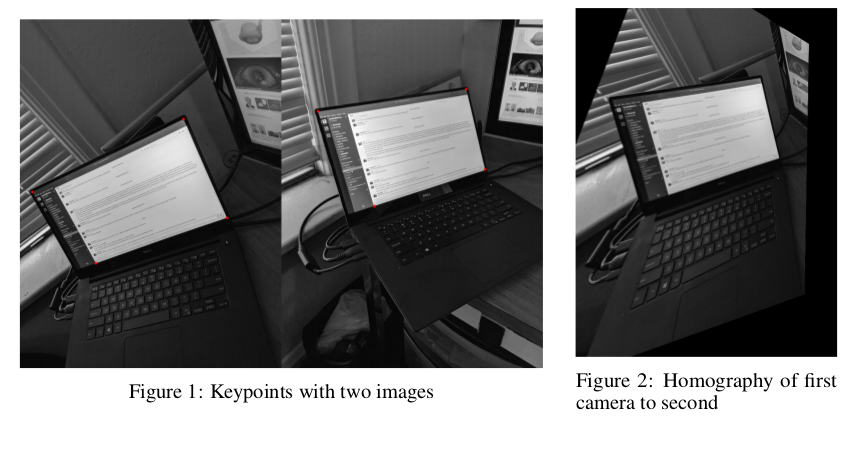 我有2张照片,从不同的角度和位置的飞机。我找到了四个匹配点,并计算出了同形矩阵,H。这张图片是用它来表示变换的,所以它很难工作。