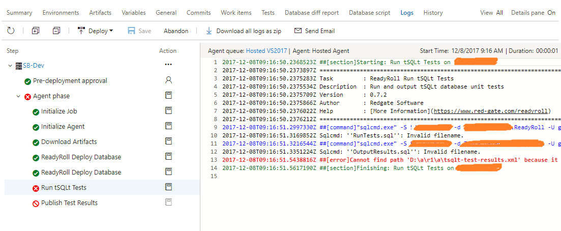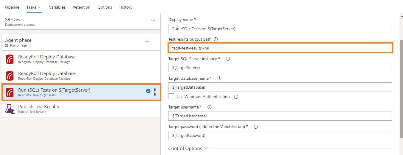 因此,您可以通过命令行任务调用sqlcmd.exe来运行测试和获取报告,也可以参考运行tSQLt测试任务的源代码来自定义构建/发布任务。