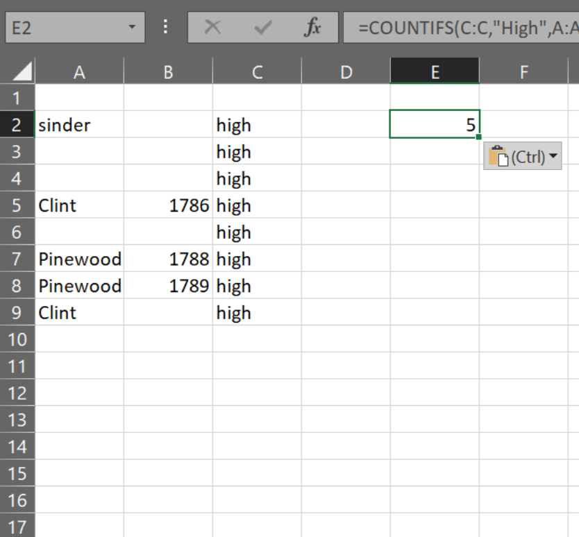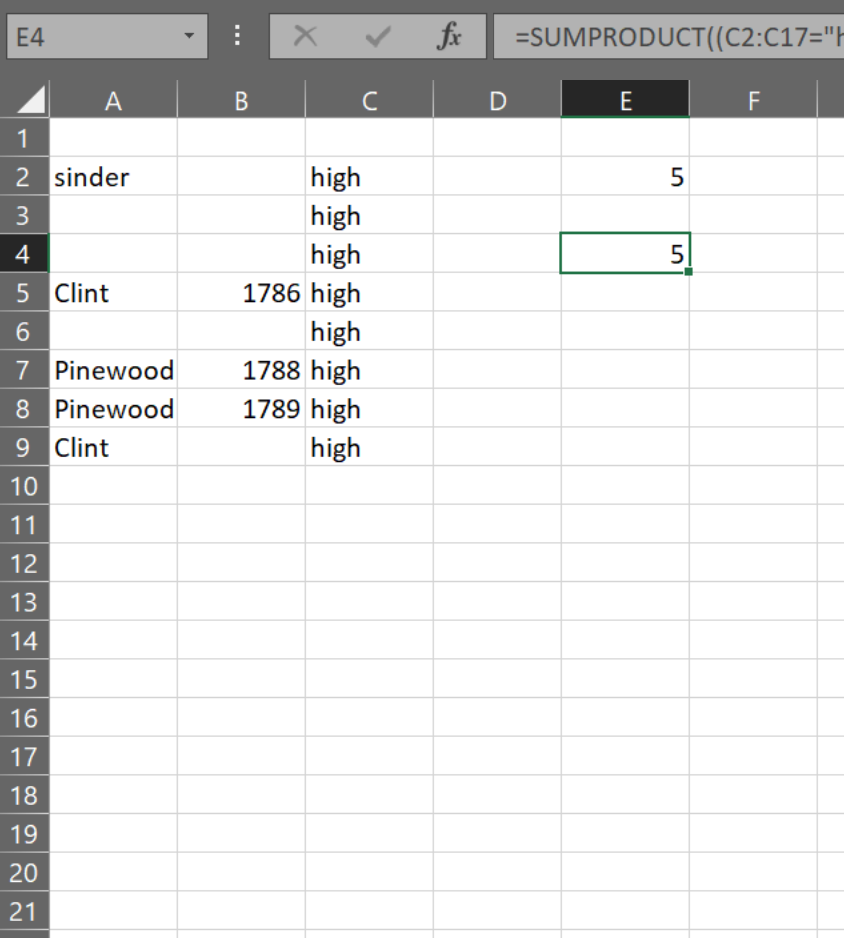 =SUM(COUNTIFS(C:C,"High",A:A,{"<>","","<>"},B:B,{"","<>","<>"}))但这要求单元格为真空白,没有返回和空字符串的公式。