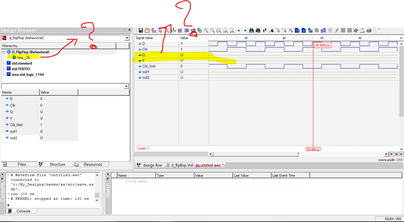 我使用active-hdl 10来编译和模拟一个DFlipFlop结构。我的代码编译成功,没有任何错误或警告,但是当我模拟它时,我的输出有未知的值。