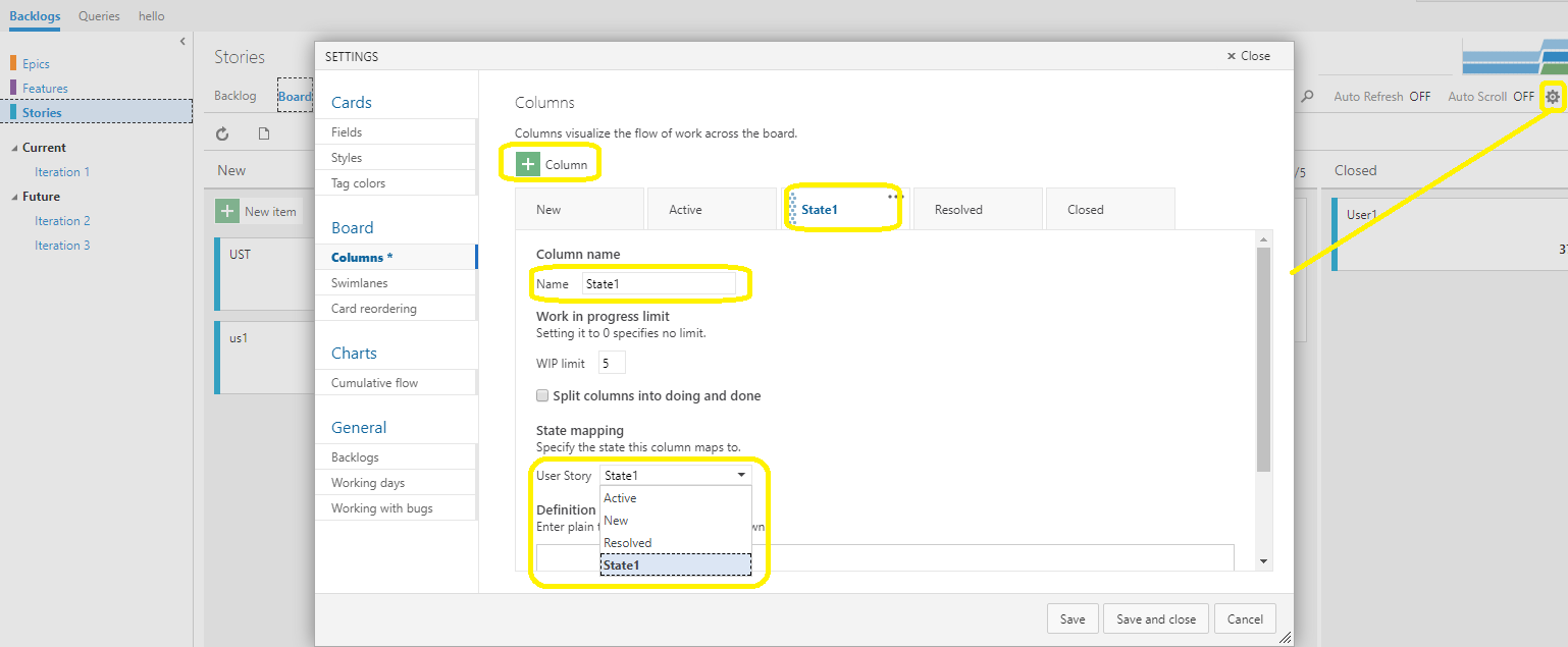 我使用的是TFS 2015.4敏捷模板。我想改变我的工作流状态,以包括分析作为一个选项。我已经修改了用户Story和ProcessConfiguration,工作流节点和有效状态等。我成功地重新上传了模板,并将新模板设置为默认值。在设置用户故事状态方面一切都很好。但是,在看板上,我想添加一个选项卡,它映射到新添加的Analysis。这个新的选项不会出现。还有什么东西我遗漏了吗?