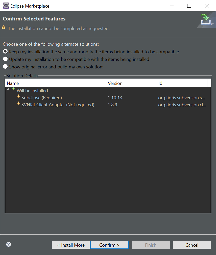 Software currently installed: Subversion Client Adapter (Required) 1.10.3 (org.tigris.subversion.clientadapter.feature.feature.group 1.10.3)