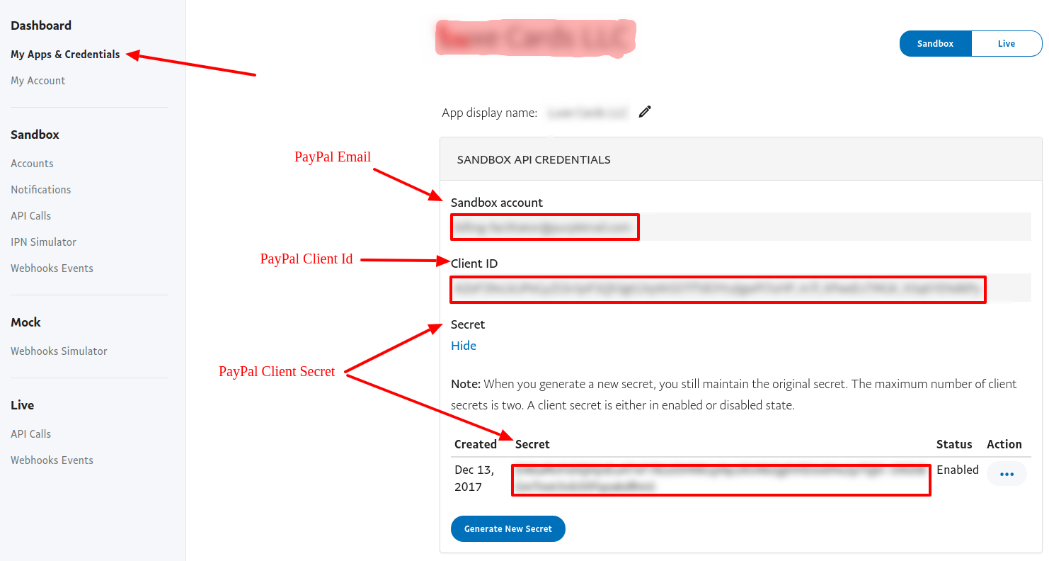 一旦创建,该应用程序的凭据将与Braintree Sandbox一起工作。