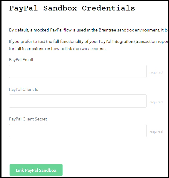 Braintree沙箱需要电子邮件、客户端id和客户端机密来链接到paypal沙箱帐户,如Braintree网关截图所示。