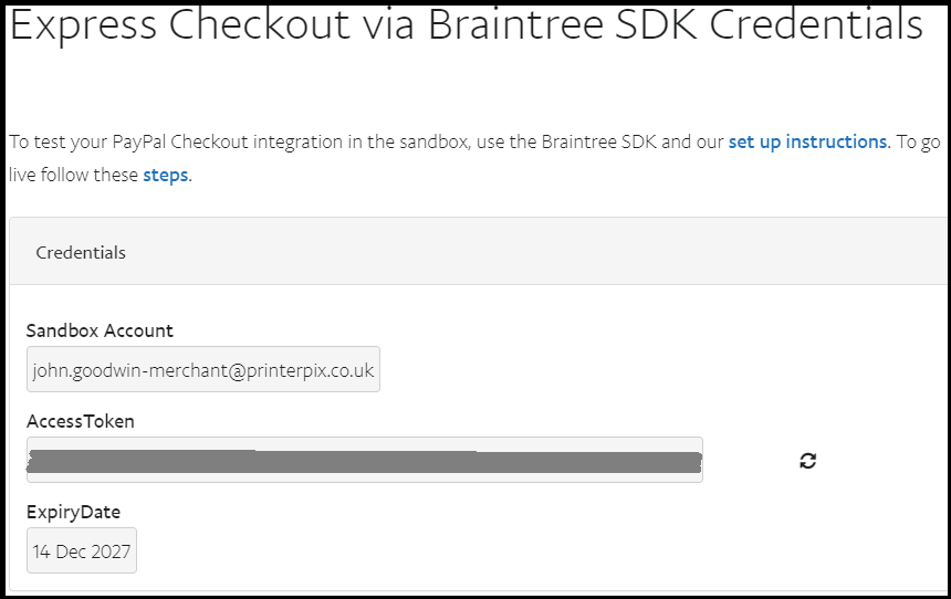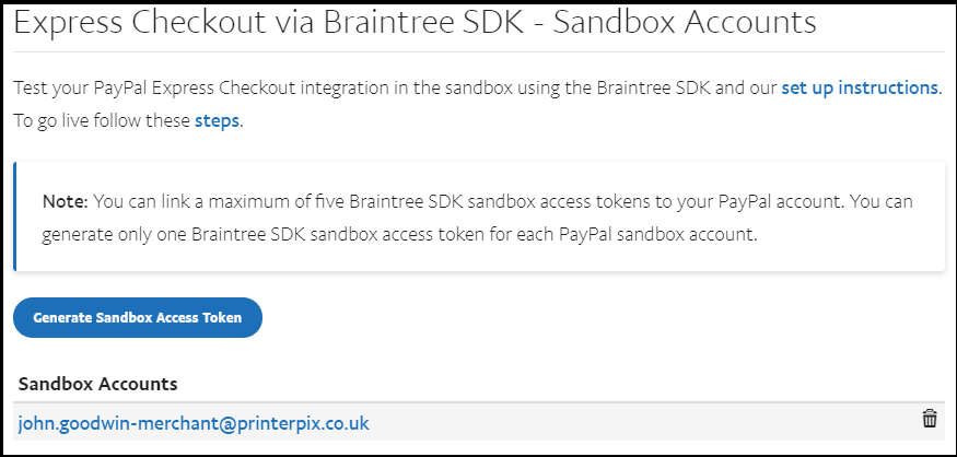 在Paypal开发者网站上,我按照此页上的说明,为Braintree生成了一个沙箱访问令牌。这样做之后,底部的蓝色帐户链接出现了: