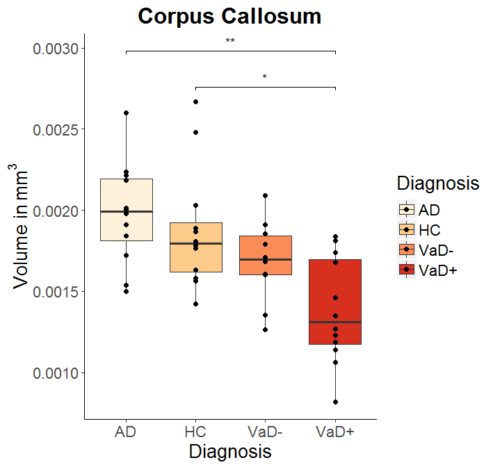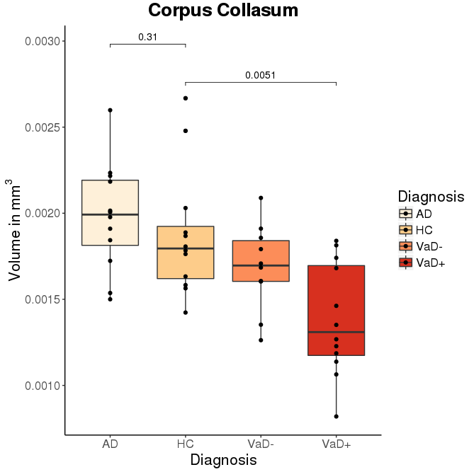 myplot <- ggplot(my.data, aes(x = DX, y = CC, fill=DX)) + geom_boxplot() + ggtitle("Corpus Collasum") + theme(text=element_text(size = 16), panel.grid.major = element_blank(), panel.grid.minor = element_blank(),panel.background = element_blank(), axis.line = element_line(colour = "black"), plot.title = element_text(lineheight=.8, face="bold", hjust=0.5)) + scale_y_continuous(name = bquote('Volume in'~mm^3)) + scale_x_discrete(name = "Diagnosis", labels = c("AD","HC","VaD-","VaD+")) + scale_fill_brewer(palette="OrRd", name="Diagnosis", labels=c("AD","HC","VaD-","VaD+")) + geom_jitter(width = 0)