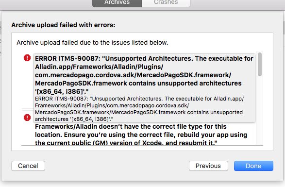 错误的ITMS-90209:“无效的段对齐。在'Alladin.app/Frameworks/MercadoPagoSDK.framework/MercadoPagoSDK‘的应用二进制没有正确的段对齐。尝试用最新的Xcode版本重建应用程序。” 错误ITMS-90125:“二进制文件无效。LC_ENCRYPTION_INFO加载命令中的加密信息要么丢失,要么无效,或者二进制文件已经加密。这个二进制文件似乎不是用苹果的链接器构建的。” 错误ITMS-90125:“二进制文件无效。LC_ENCRYPTION_INFO加载命令中的加密信息要么丢失,要么无效,或者二进制文件已经加密。这个二进制文件似乎不是用苹果的链接器构建的。” 错误ITMS-90087:“不支持的体系结构。Alladin.app/Frameworks/MercadoPagoSDK.framework的可执行文件包含不支持的架构'x86_64,i 386‘。”错误的ITMS-90087:“不支持的体系结构。Alladin.app/Frameworks/MercadoPagoSDK.framework的可执行文件包含不支持的架构'x86_64,i 386‘。