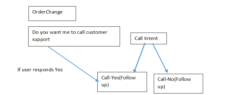 我还有一个意图OrderChange。作为对OrderChange意图的回应,bot告诉用户用户是否想要呼叫客户支持。基于用户的“是”/“否”,我希望触发呼叫意图的后续“是”或“否”。