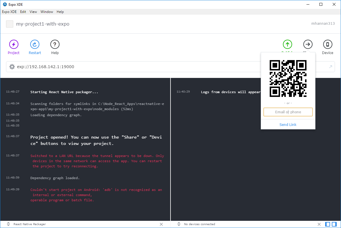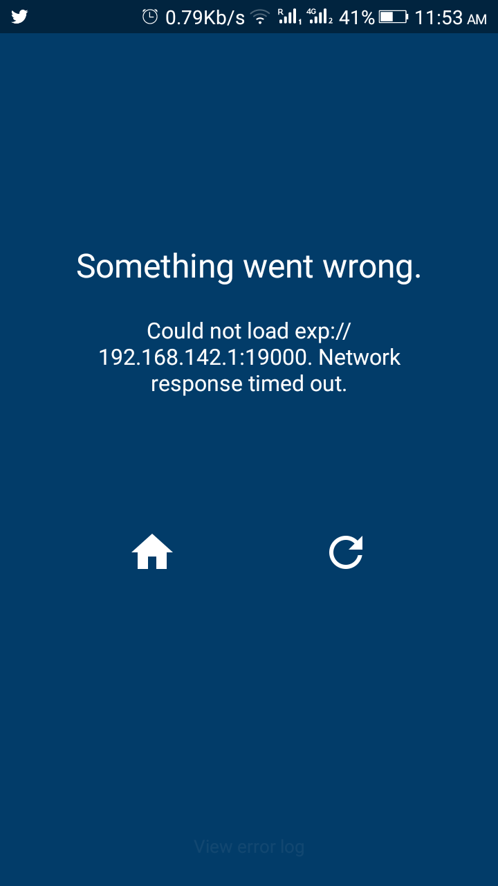 我也看到过类似的问题,但没有人解决这个问题。我刚刚从世博会桌面应用程序创建了新的ReactNative项目。但当世博会配置设置为LAN模式时,我无法通过QR代码扫描在我的Android手机上运行它。在我的Android手机上似乎无法访问(看上去)。我的手机在同一个Wifi网络上。