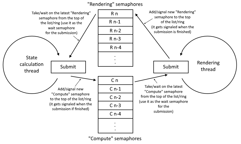 我增加了一个图片,或多或少地显示了我认为你应该做什么。一个线程计算状态,每个提交都在列表的顶部添加一个信号量(或者@NicolasBolas所写的环形缓冲区)。当提交完成时,这个信号量会得到信号(在“计算”批处理提交期间,它是在pSignalSemaphores中提供的)。