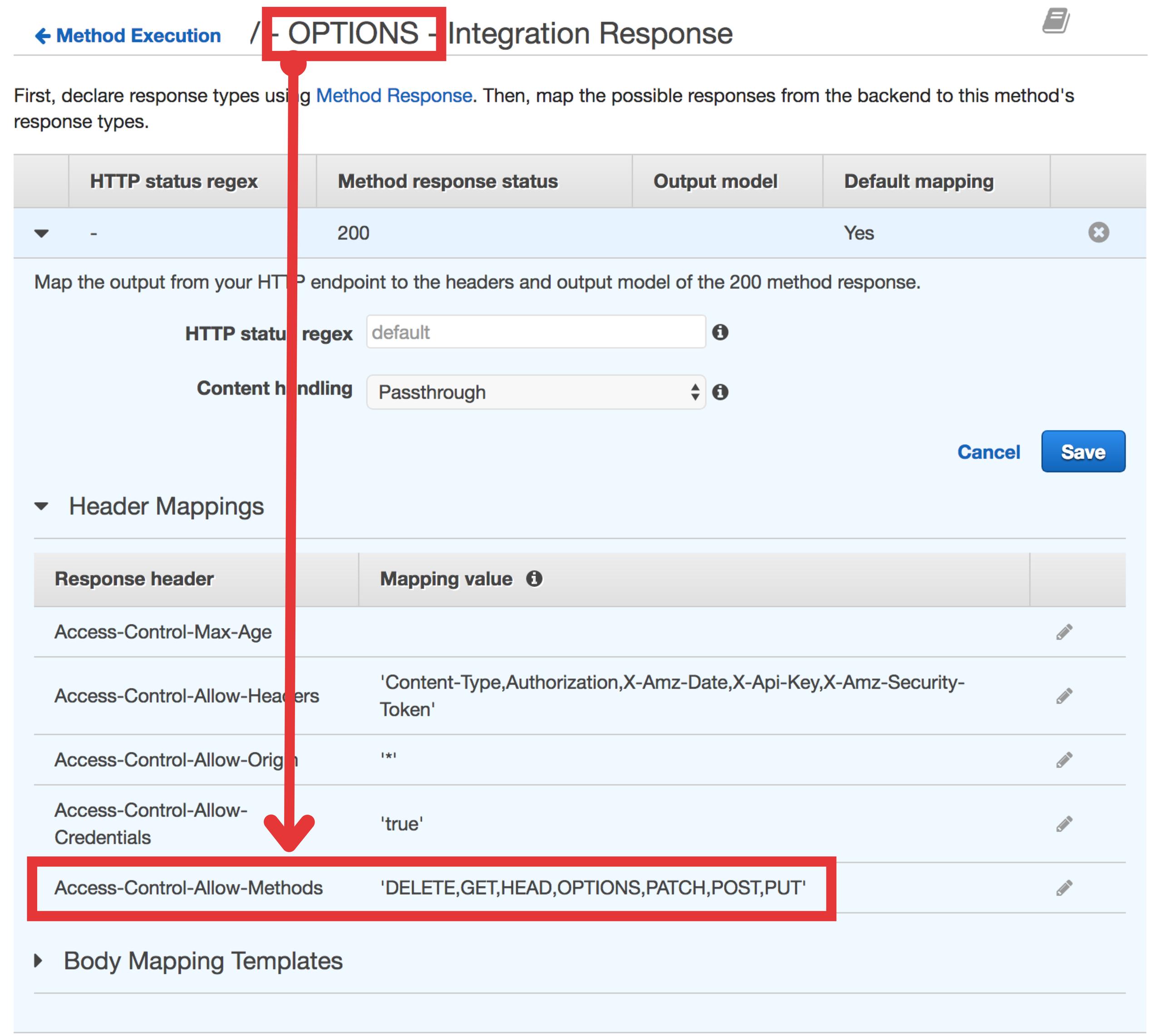 如果这个标头值是通过aws-api-gateway -> resources -> OPTIONS > Integration Response设置的,那么如果您要执行一个claudia update,它将被重写回其默认状态,如下所示。