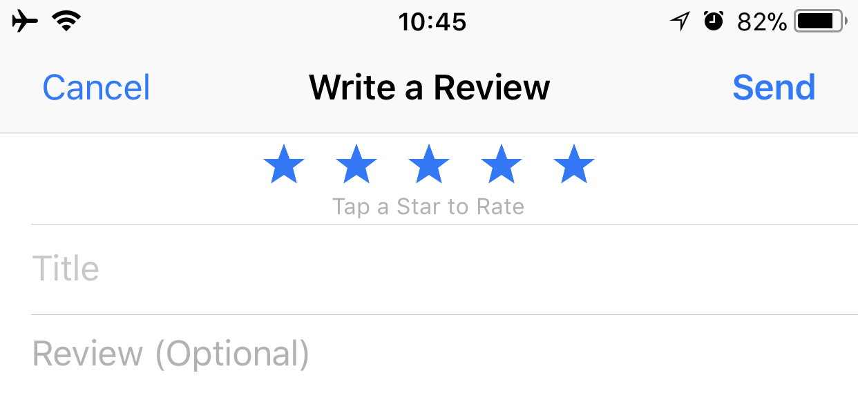 requestReview()提示符下的Submit按钮会将您重定向到--编写应用程序的评论页面,星号部分已经填写完毕。您可以选择在那里输入一个标题和详细的评论。(描述文本具有误导性,标题是可选的。)