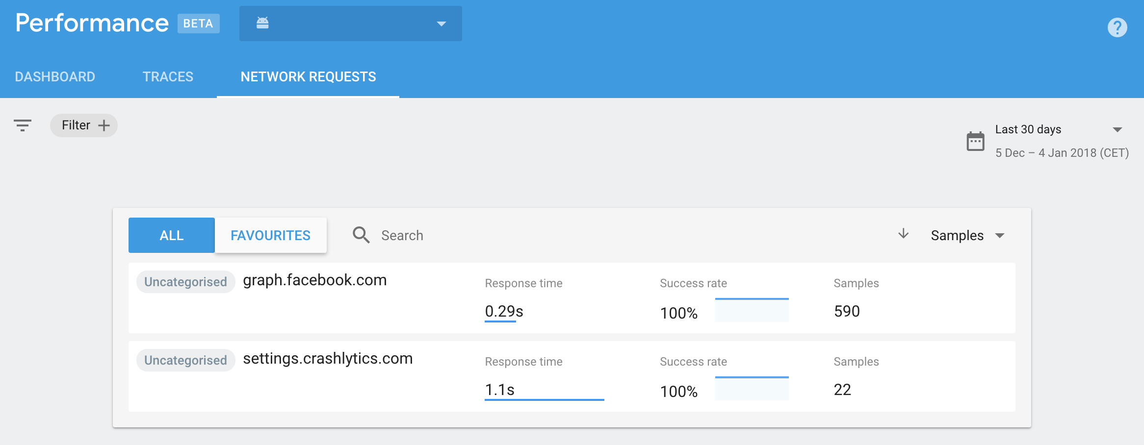 遗憾的是,在Firebase性能的“网络请求”选项卡中,没有一个通过Retrofit提出的请求可见。