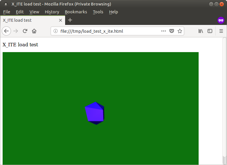 假设我有文件test.x3d (包括下面),从搅拌机导出。然后,我可以使用x3dom或ITE X3D浏览器 JS库将其加载到HTML页面中。下面还包括了每个例子,load_test_x3dom.html和load_test_x_ite.html。我得到的渲染如下: