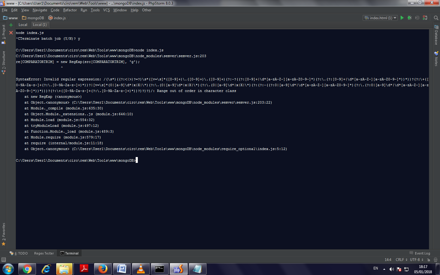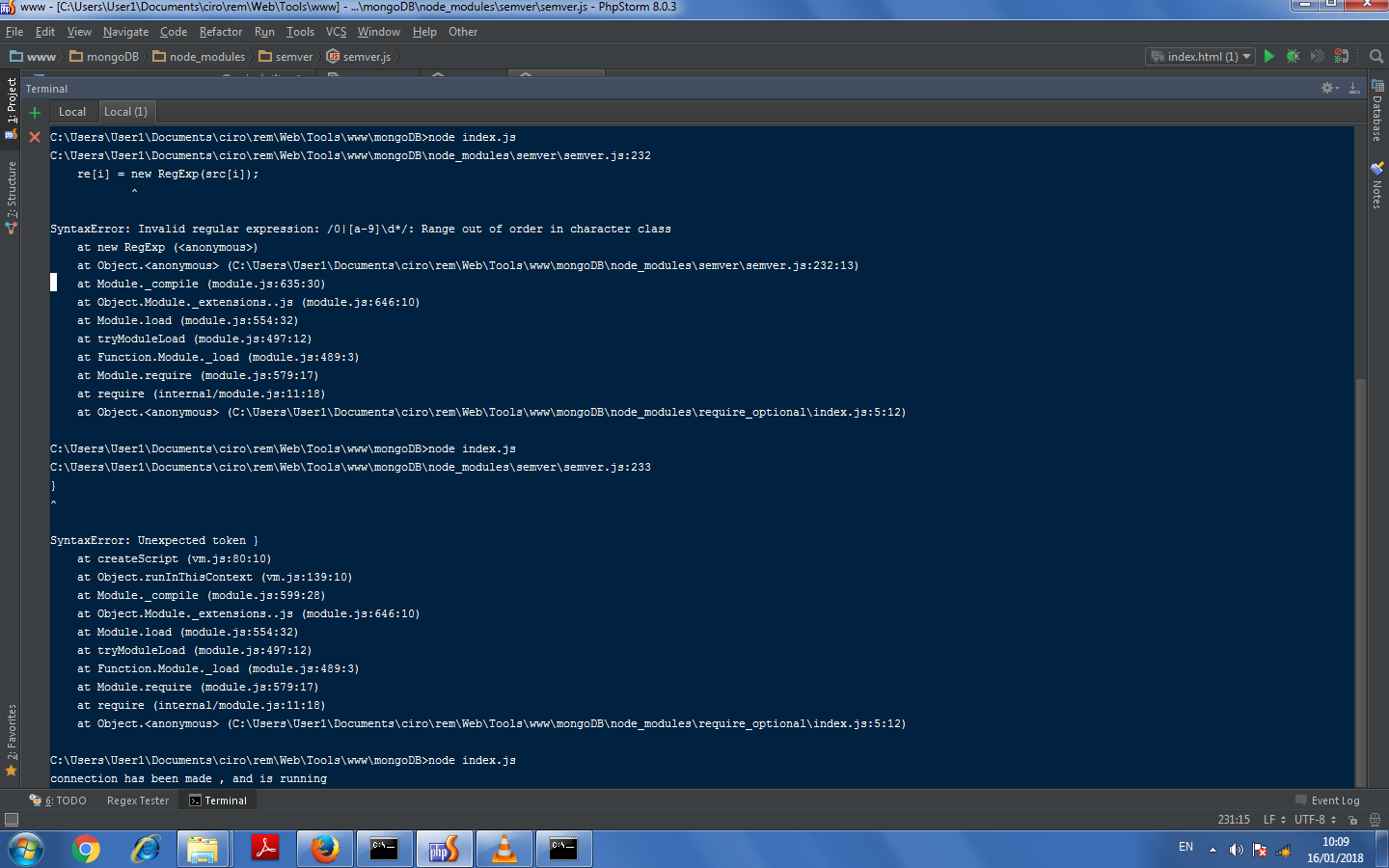 当我试图从逗号提示‘节点index.js’运行索引文件时,我得到以下错误,请参阅图片中的详细信息,我已经包含了用于设置mongo的代码.我已经从phpstorm存储库禁用了mongoserver,并使用了mongodb网站上的一个。