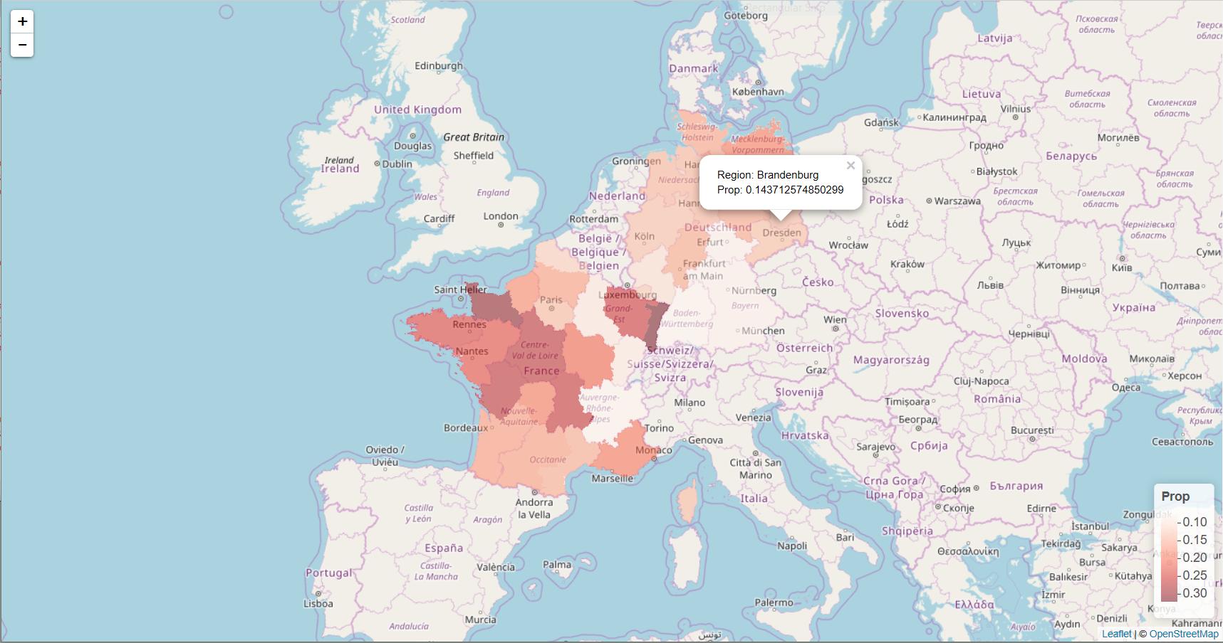 我把Germany_map和France_map组合在一起,这样我就可以同时画多边形了。然后,我为prop创建了颜色。使用addPolygons()时,可以指定fillColor = ~mypal(mydata$prop)。道具值不必停留在多边形数据中。同样,您可以在values = mydata$prop中指定addLegend()。您可以看到下面的结果是屏幕截图。