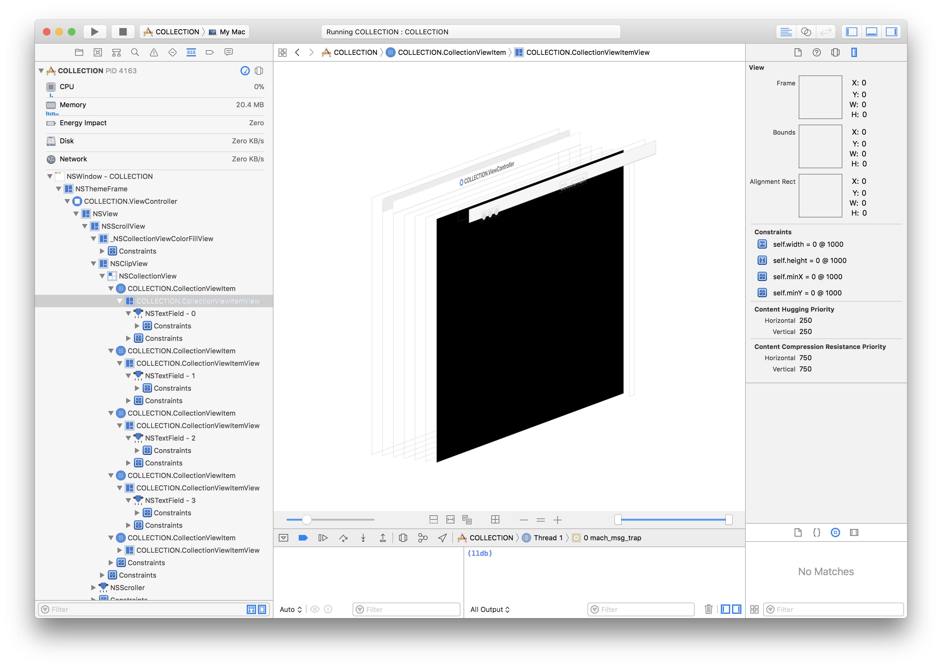 }现在,尽管我使用的是NSCollectionViewFlowLayout,符合NSCollectionViewDelegateFlowLayout并提供sizeForItemAt all索引,但最终的CollectionViewItemView总是大小为0,如下所示: