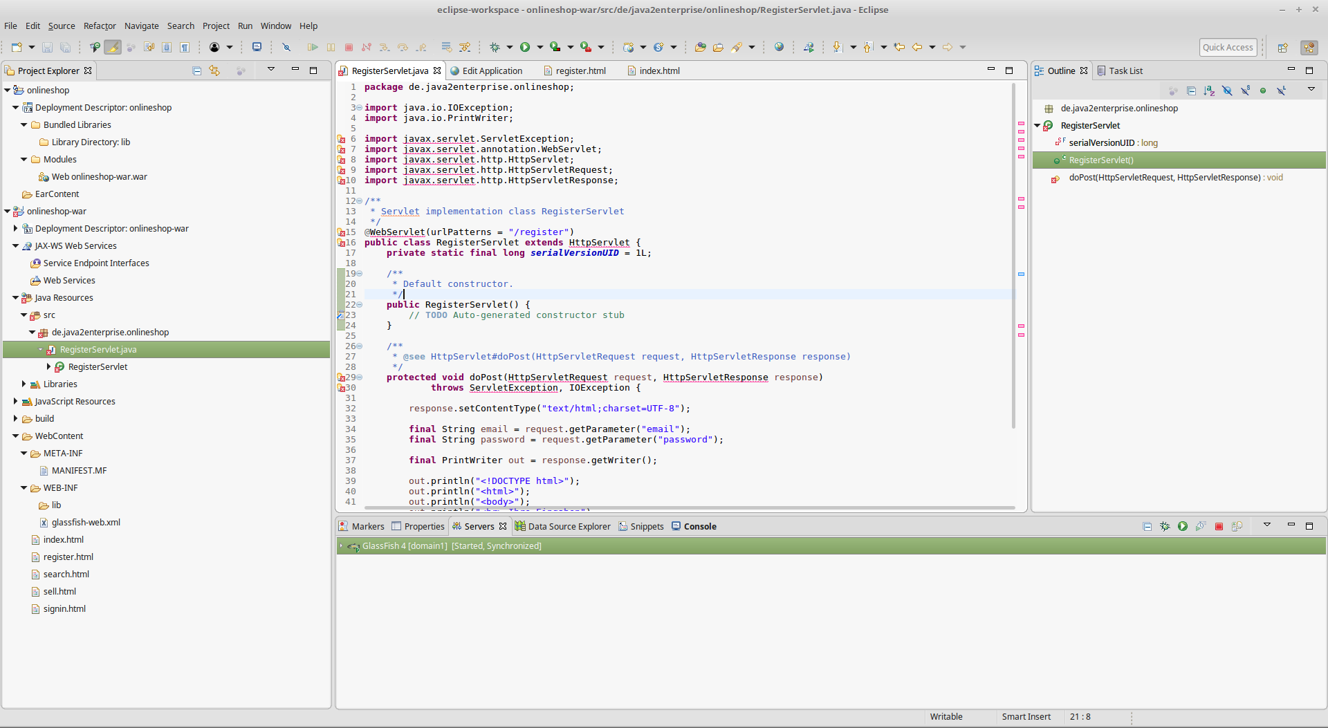 我将eclipse与Java-8和Tomcat 8.5 web container结合使用,通过查看您的问题,我在eclipse中创建了一个新的dynamic web project,随后在您定义的包中创建了两个html文件index.html和register.html以及Servlet class RegisterServlet。