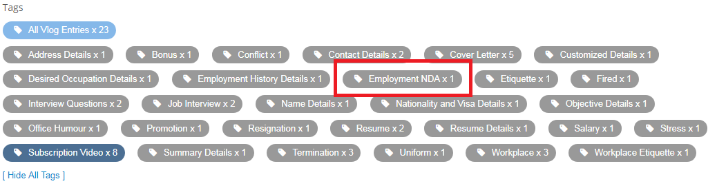在这个场景中,Employment NDA的标记不应该显示给用户,因为使用该标记的vlog条目还没有显示给用户,因为vlog_date_published大于今天(在本文发布时)。