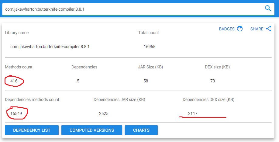 它显示库的方法数和库中使用的所有依赖项的方法数。像这样: