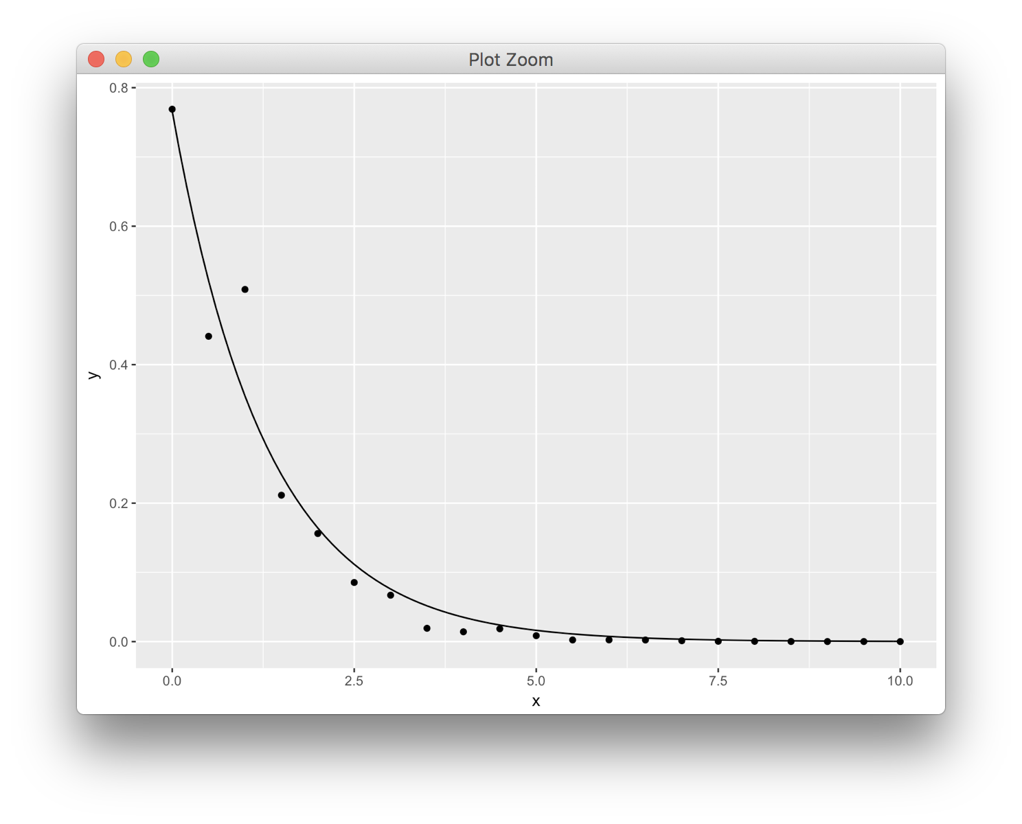 y <- exp(-x) * rnorm(length(x), mean = 1, sd = .3)