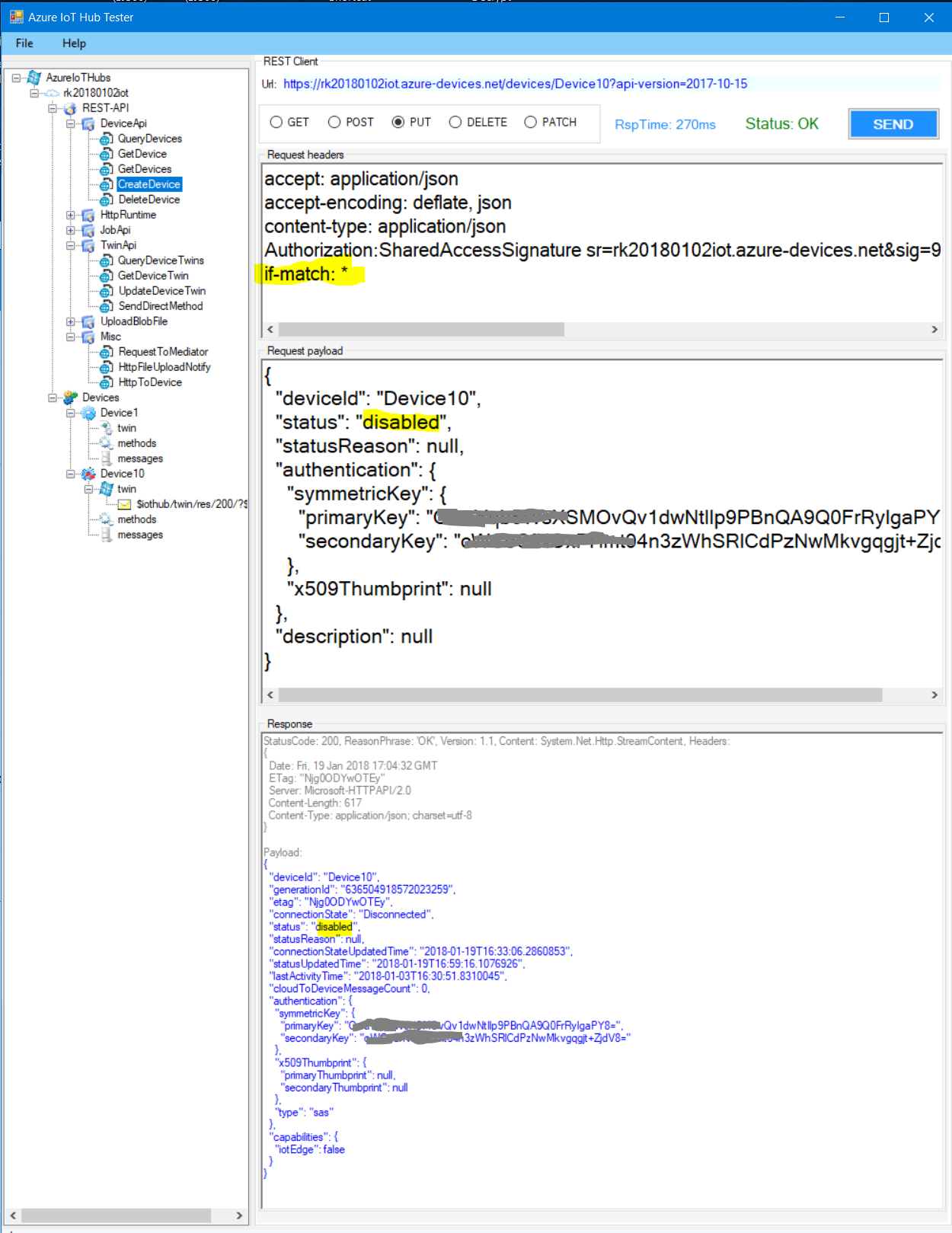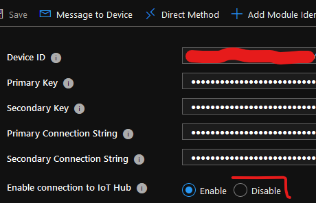 顺便说一下。要禁用的UI路径是portal.azure.com -> IoT集线器->物联网设备->查找设备->禁用