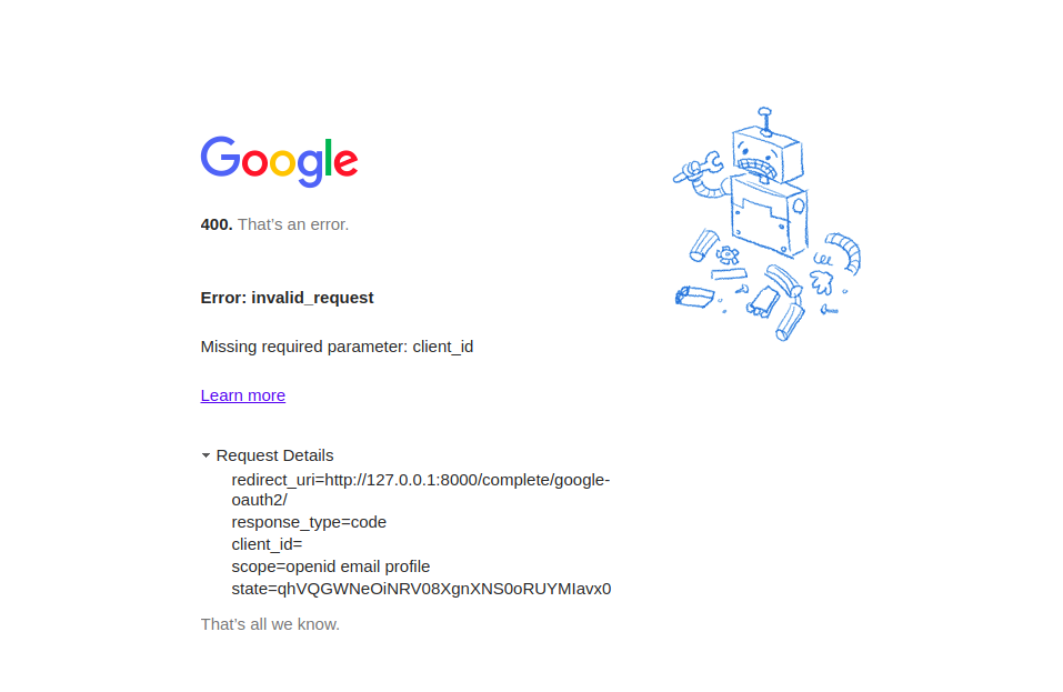 我已经安装和配置了social-auth-app-django,并在我的登录页面中添加了一个与google注册的选项。但是每当我点击链接时,我就会得到这个错误。