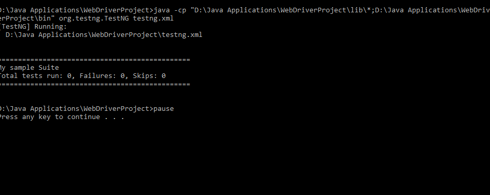 java -cp "D:\Java Applications\WebDriverProject\lib*;D:\Java Applications\WebDriverProject\bin" org.testng.TestNG testng.xml pause