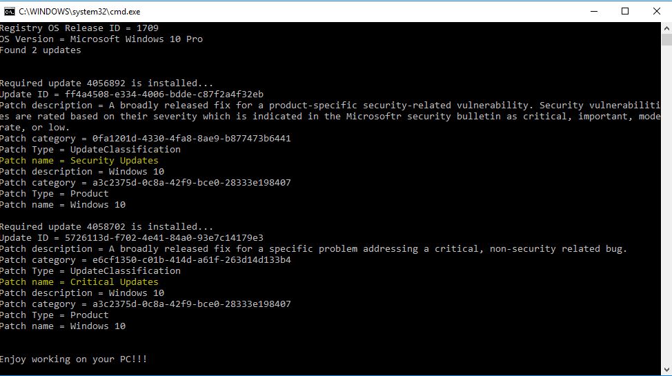 Console.WriteLine("Required update " + update.KBArticleIDs[0].ToString() + " is installed...");