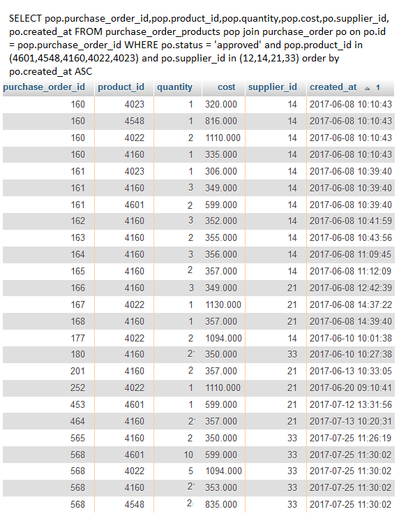 我编写了一个PHP算法,它循环遍历所有订单和采购订单,并将最老的成本用于最新的成本。但是该算法具有很高的时间复杂度。这可以仅仅使用mysql查询来完成吗?