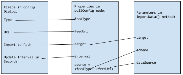 当此服务部署在AEM实例中时,您的自定义导入程序可以在轮询配置的下拉列表中看到。轮询配置有一个对话框,您需要在创建轮询节点时填充该对话框。下图显示了配置对话框中给出的值如何映射到节点属性,然后映射到importData()方法: