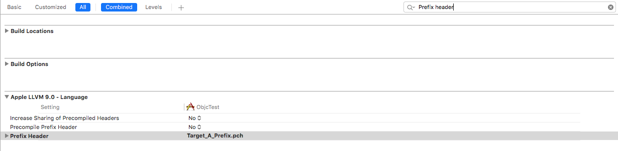 在Build中,转到Prefix Header并为每个配置设置到.pch的路径。对所有目标都做同样的事情。