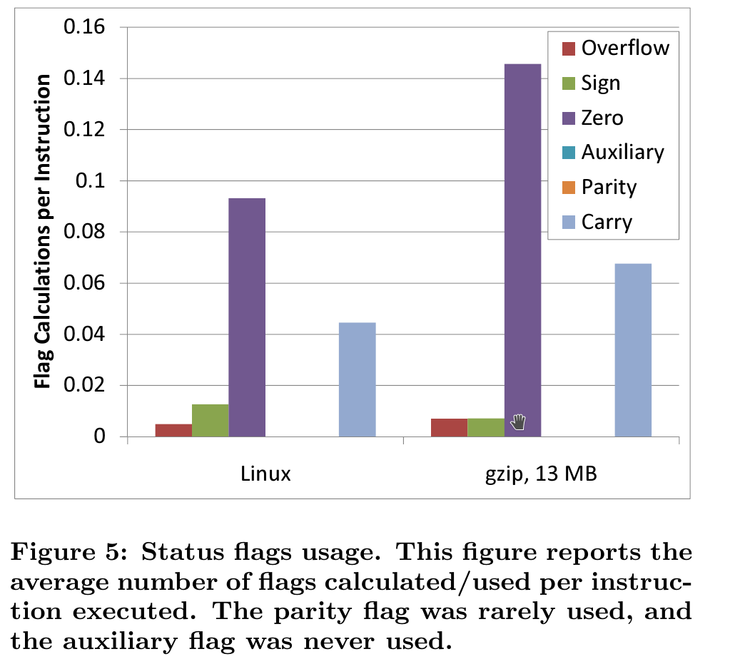 正如您所看到的,没有人关心辅助标志,而进位和零标志会影响代码中的许多决策。其他作者也得出了类似的结论,这些结论在软件仿真设计中很重要,因为它们允许在二进制翻译和口译中应用一个重要的惰性标志评估优化。