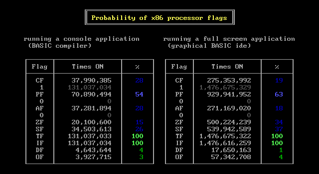 但是其他的旗帜呢?进位标志(CF)、辅助标志(AF)、零标志(ZF)和符号标志(SF)似乎稳定在25%,但奇偶校验标志(PF)在50%以上跳出。