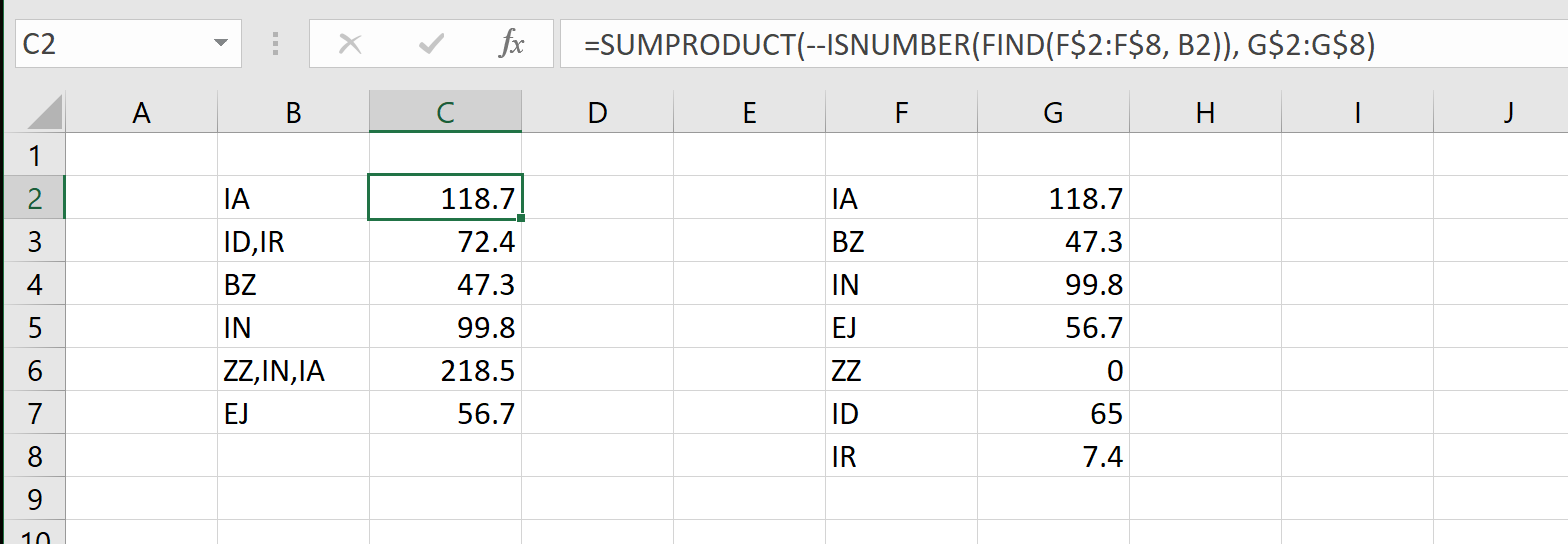 =SUMPRODUCT(--ISNUMBER(FIND(F$2:F$8, B2)), G$2:G$8)