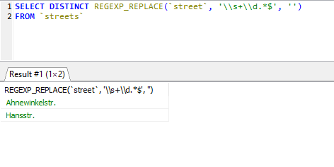 现在,我希望MySQL只提取街道名称的第一个字母部分,在第一个数字字符之后省略任何内容,并返回一个提取出来的不同街道名称的列表。