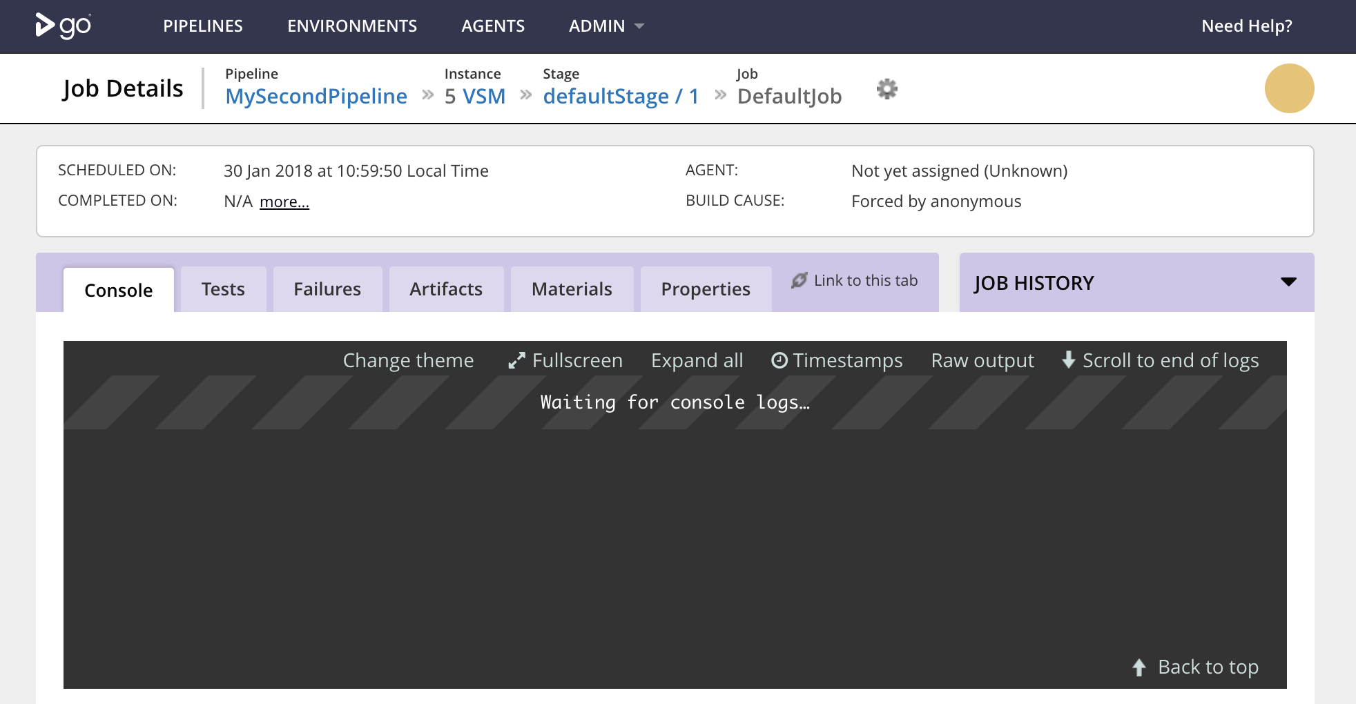 我试图在GoCD中运行一个非常简单的自定义命令"echo“,根据入门指南第2部分,但是,作业没有以控制台表示Waiting for console logs和原始输出表示Console log for this job is unavailable as it may have been purged by Go or deleted externally.来结束。